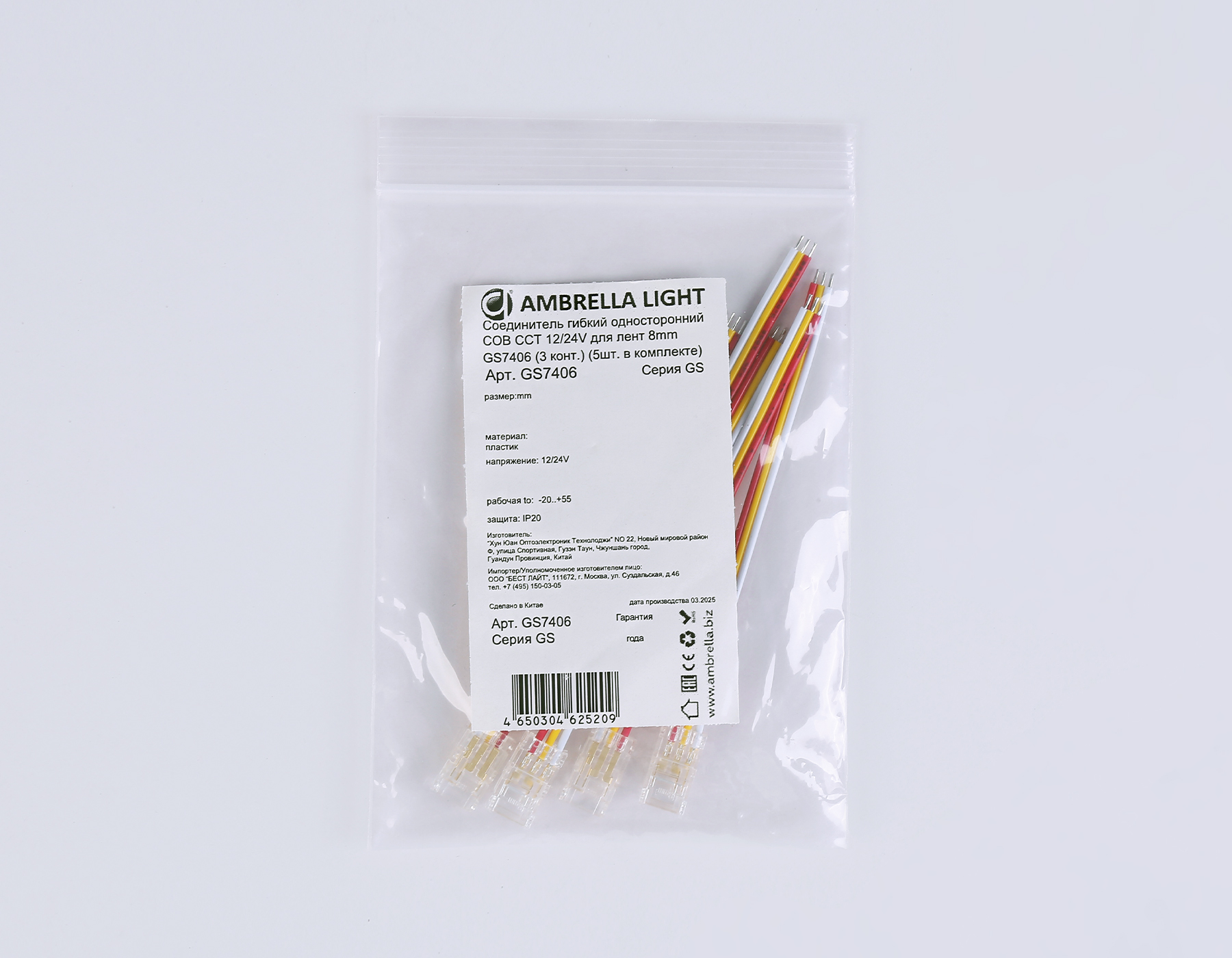 GS7406 Соединитель гибкий односторонний COB CCT 12/24V для лент 8mm (3 конт.) (5шт)