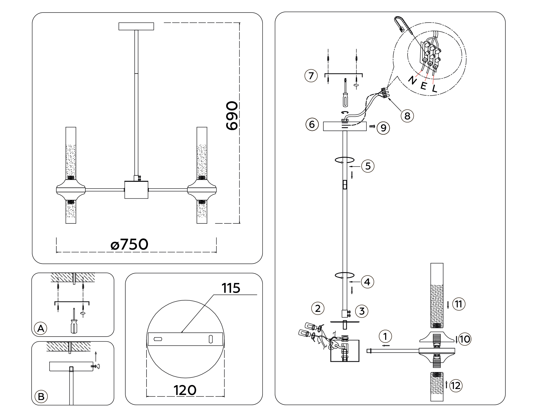 Люстра со стеклянными плафонами на штанге