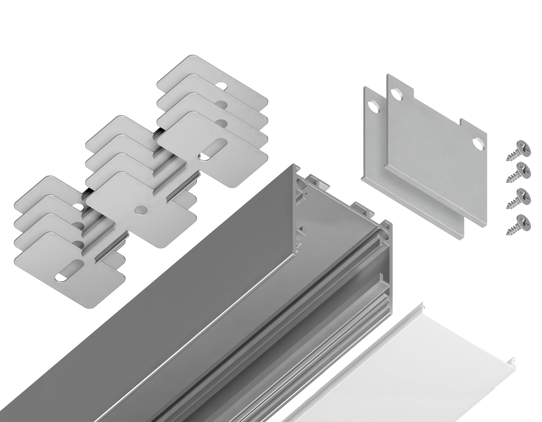 - профиль - 2 м., рассеиватель - 2 м., заглушки - 2 шт., крепления - 4 шт.
