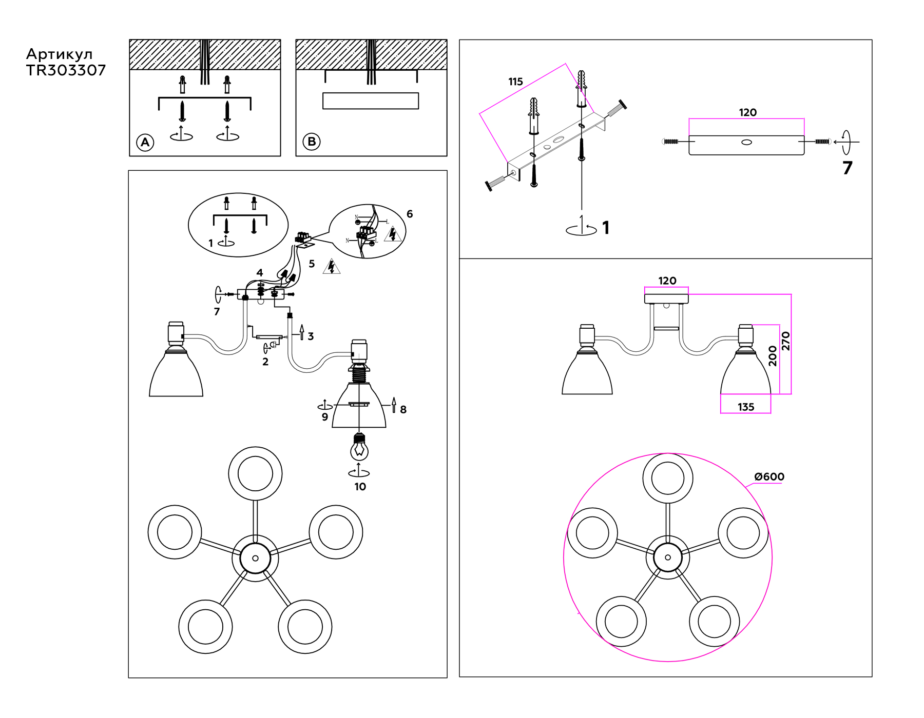 TR303307/5 BK/GD/FR черный/золото/белый матовый E27*5 max 60W D600*270