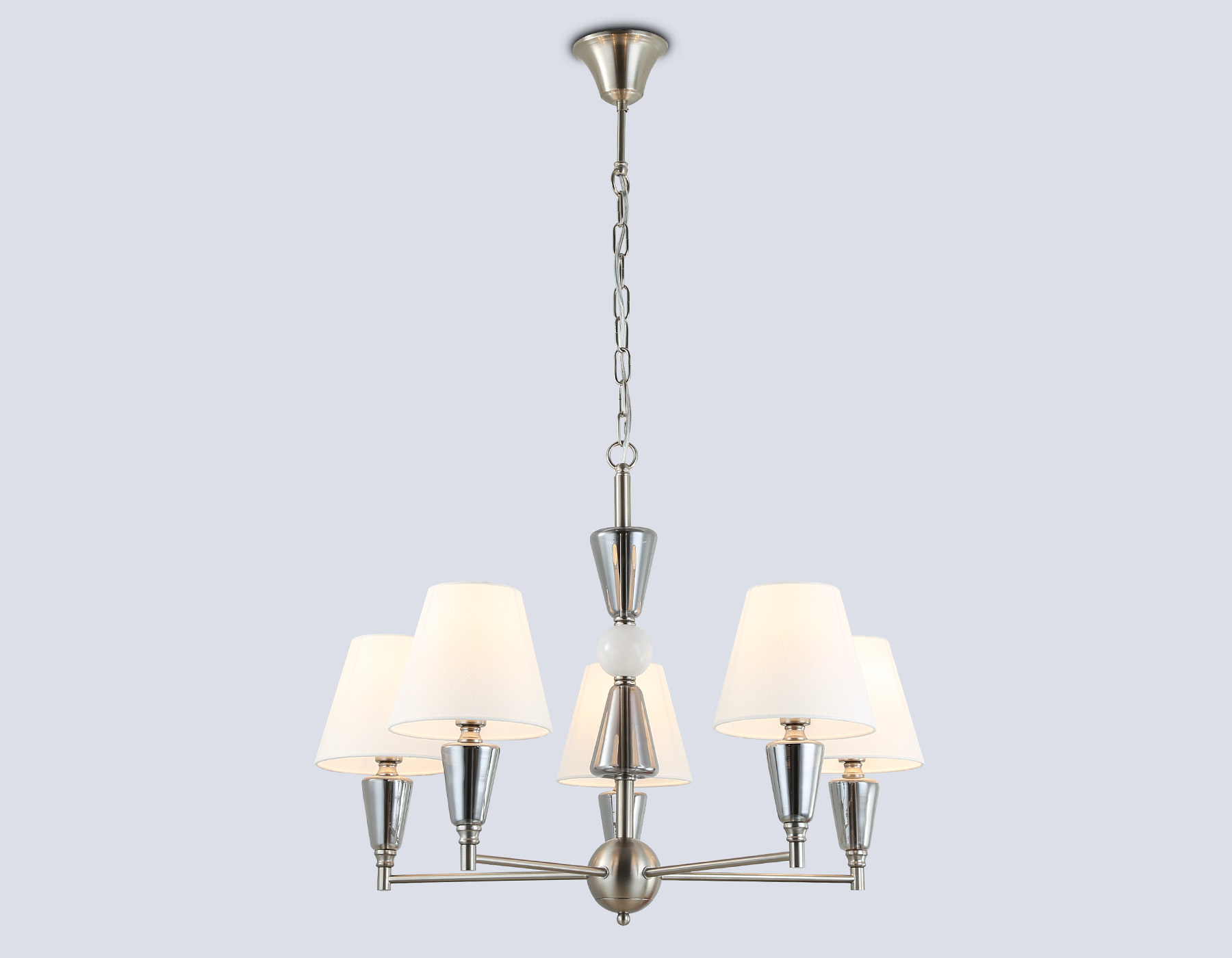 Подвесная люстра из коллекции HIGH LIGHT. Модель LH75253 представлена в стиле неоклассика. Люстра выполнена из металлического каркаса цвета сатин никель и белого тканевого абажура, а также декорирована стеклянными элементами. Имеет пять цоколей Е14. Люстра будет прекрасным дополнением в любом помещении.