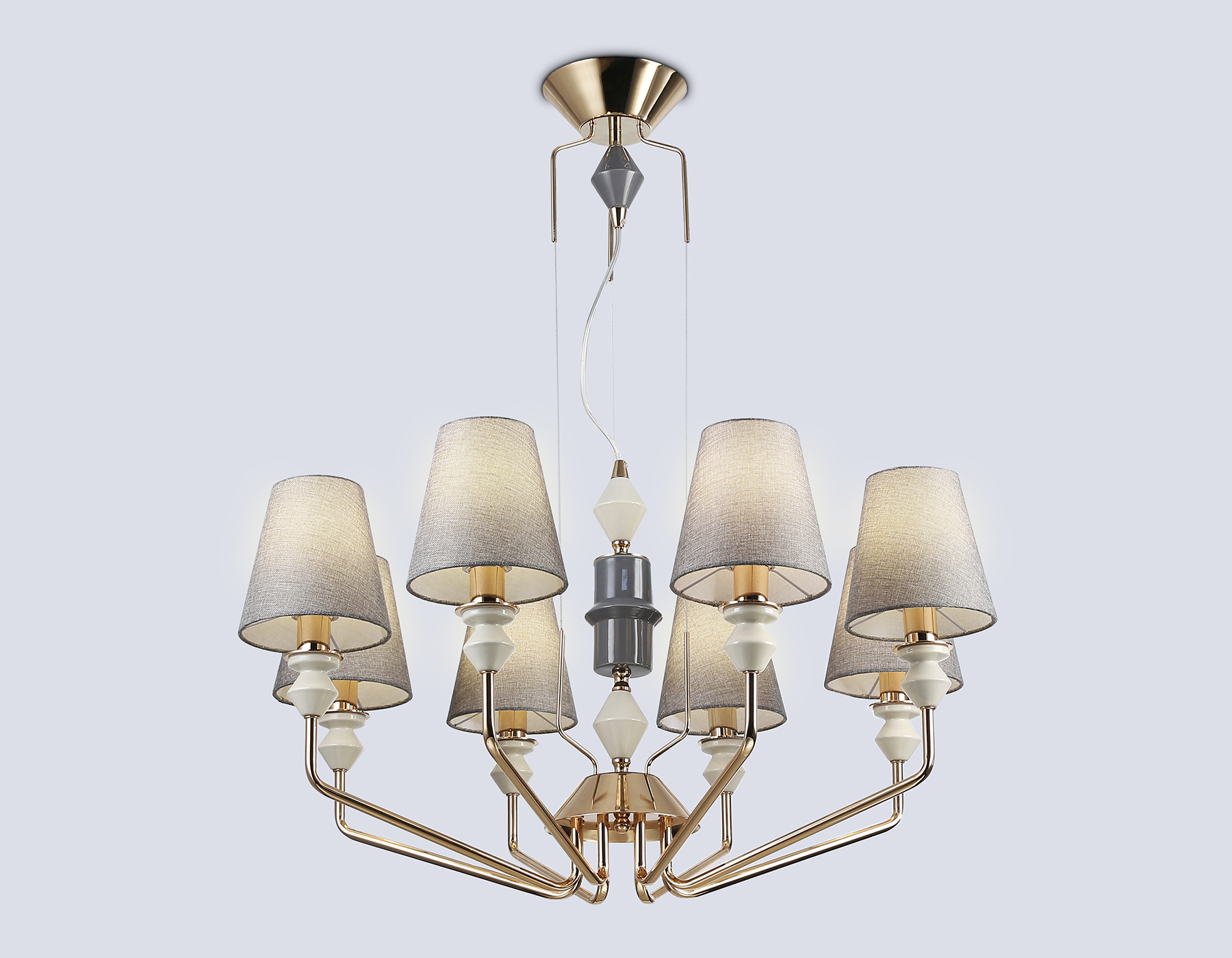 Подвесная люстра с абажурами из коллекции HIGH LIGHT. Модель LH75403 представлена в классическом стиле. Люстра выполнена из тканевых плафонов серого цвета, металлического каркаса цвета "золото" и декорирована элементами из керамики. Для данной модели подойдут лампы с цоколем Е14. Люстра будет прекрасным дополнением в любом помещении.